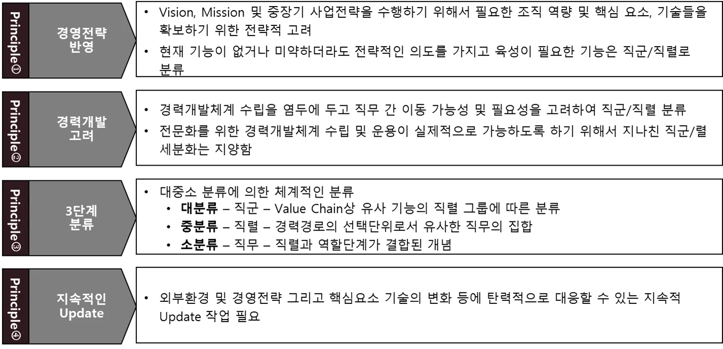 직무분류는 경영전략 반영, 경력개발 고려, 3단계 분류, 지속적인 Update 등을 기본원칙으로 실시합니다.