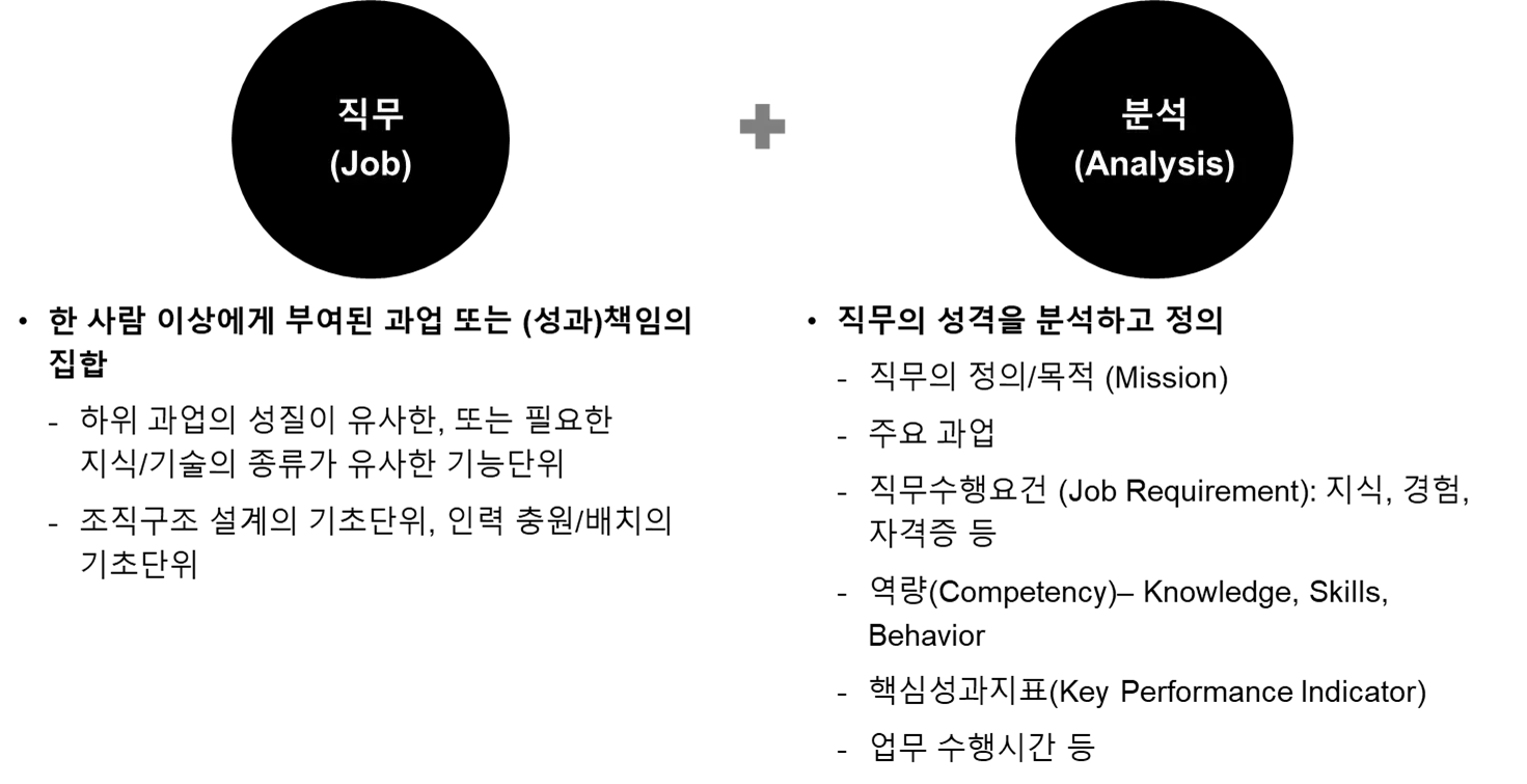 직무분석은 인적자원을 과학적이고 합리적으로 관리, 육성하기 위한 토대를 마련하기 위한 것으로 직무정의 및 목적, 주요 과업, 직무수행요건,역량, 핵심성과지표, 업무수행시간 등을 파악하는 것을 말함