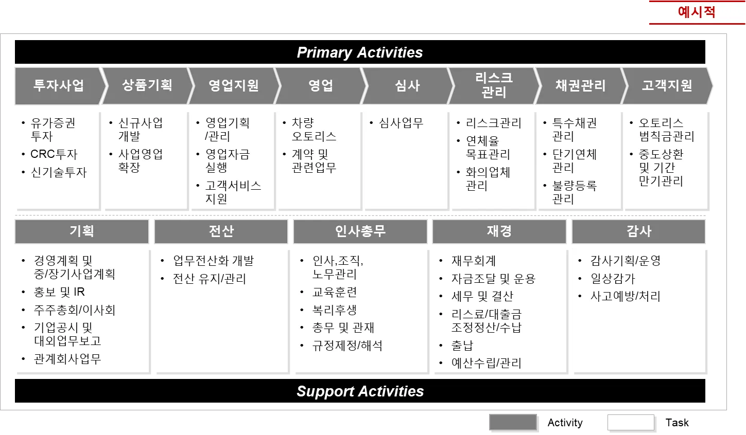 전사 사업·전략 수행을 위한 일련의 Activities를 기준으로 유사 과업을 구분하여 도출된 Value Chain은 아래와 같습니다.