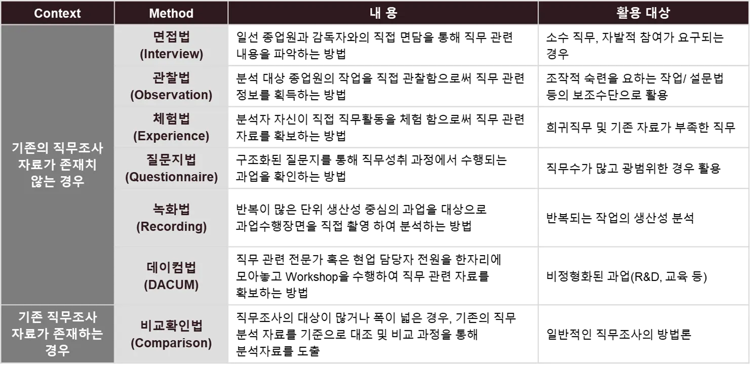 직무조사를 수행하기 위한 방법론은 아래와 같으며, 일반적으로 비교확인법을 사용합니다.