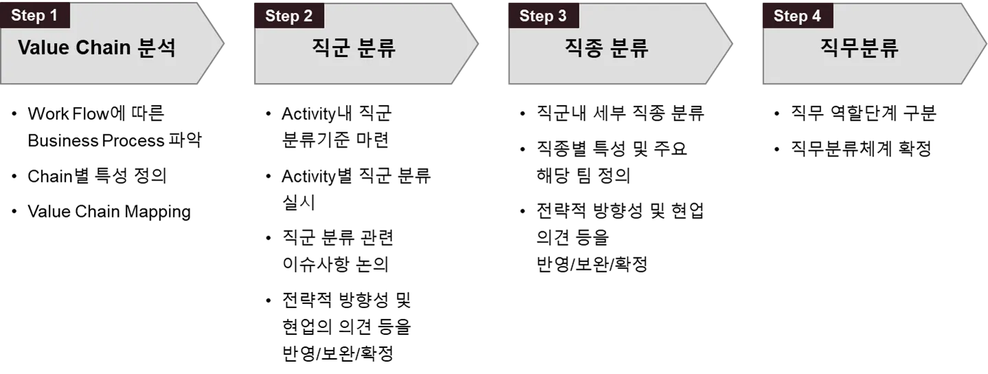 직무분류체계 수립 절차는 다음과 같은 4단계 절차를 거쳐 수립됩니다.