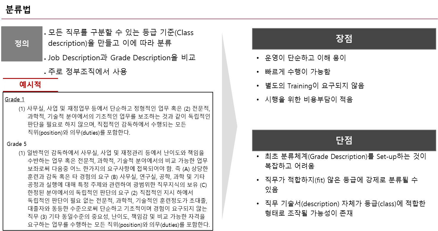 분류법은 직무등급에 대한 사전 기준을 제시하고, 이를 참고하여 기존의 직무 등급을 부여하는 정성적 직무평가 방식 입니다.