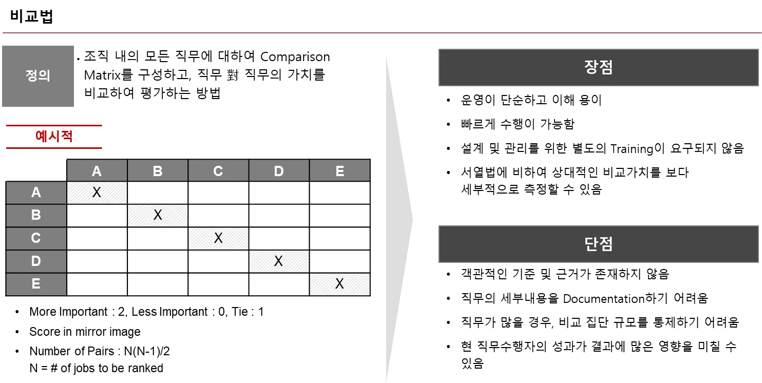 비교법은 각 직무에 대한 직관적인 판단을 기초로 하는 직무평가 방식 입니다.