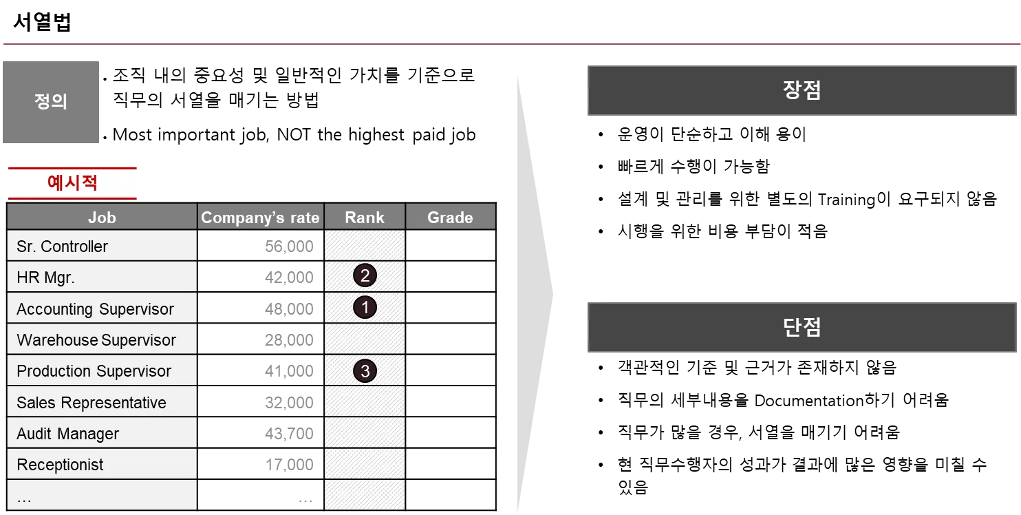 서열법은 각 직무에 대한 직관적인 판단을 기초로 하는 직무평가 방식입니다.