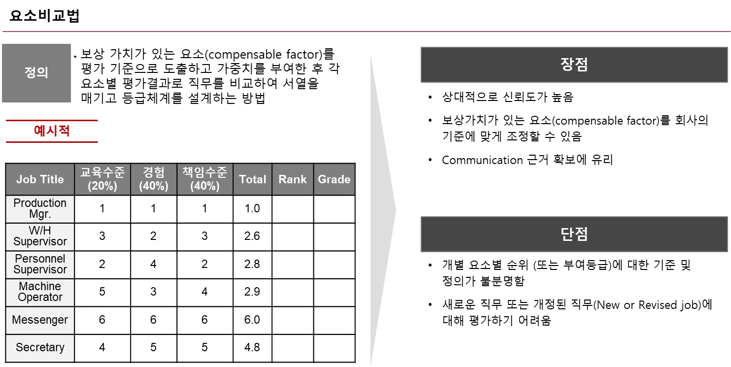 요소비교법은 직무를 구성하는 핵심 요소를 분해하고 이에 대한 표준 금액 배분표를 적용하여 해당 직무의 총 평가요소 금액을 도출하는 방식 입니다.