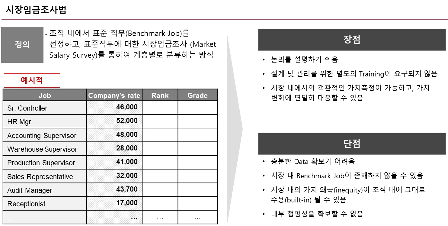시장임금조사법은 Benchmark Job에 대한 시장임금을 기준으로 직무 등급을 Slotting 하는 방식 입니다.