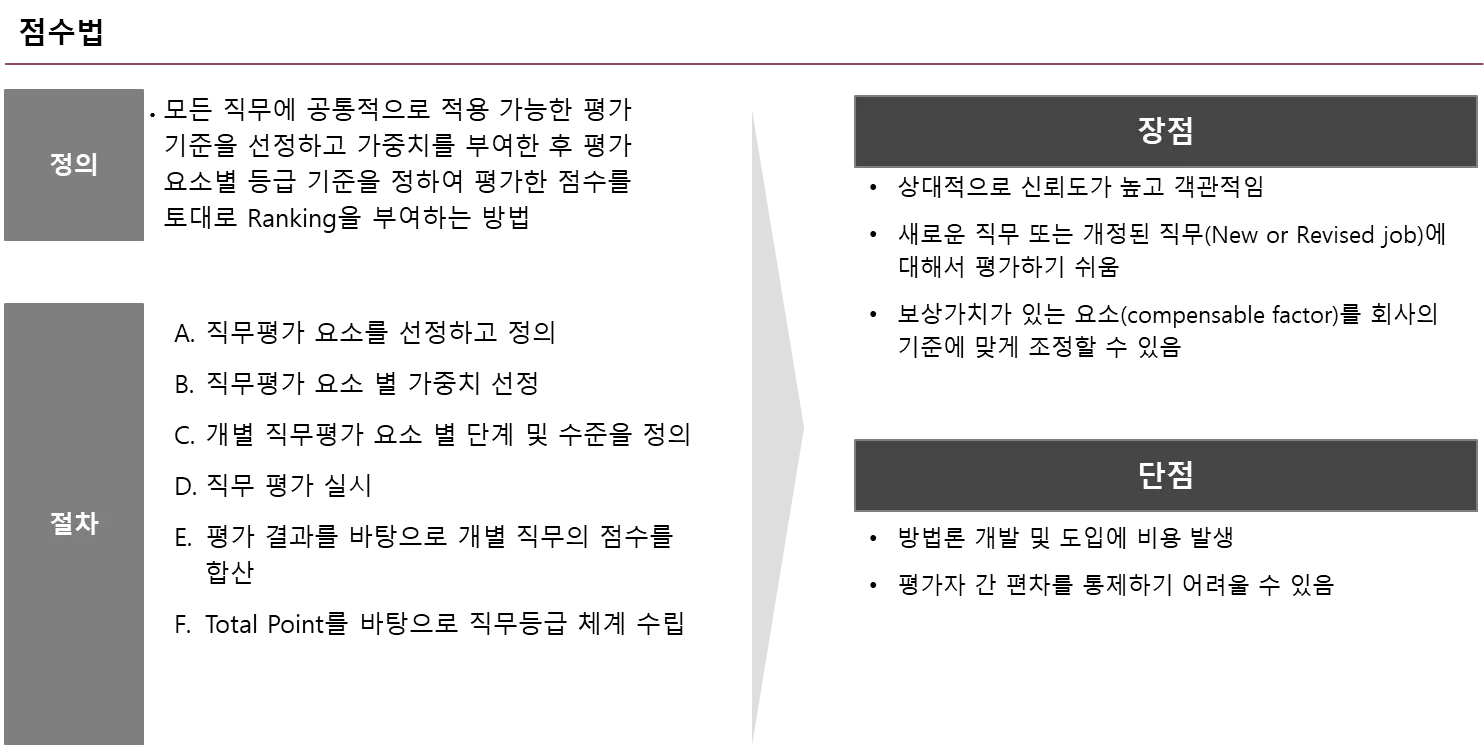 점수법은 가장 일반적으로 활용되는 점수법은 직무평가 요소에 대한 평가 및 점수화를 통해 진행 됩니다.