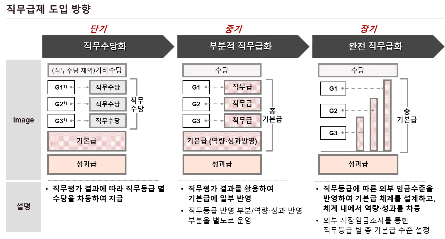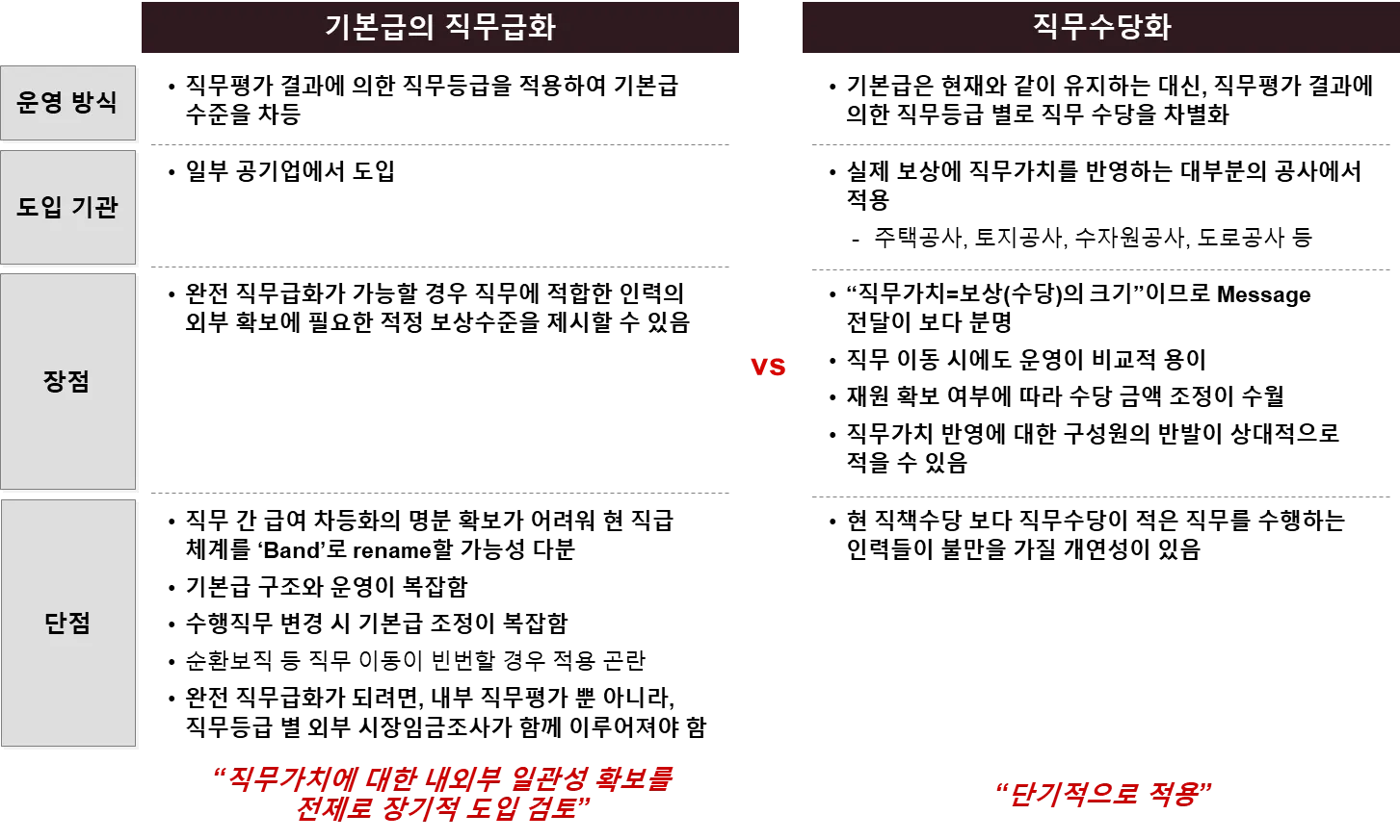 단기적으로는 재원 확보가 용이하고, 구성원들의 반발을 최소화하기 위한 직무수당화를 설계하고 장기적으로는 직무가치에 대한 내외부 일관성 확보를 전제로 한 기본급의 직무급화 도입을 검토합니다.