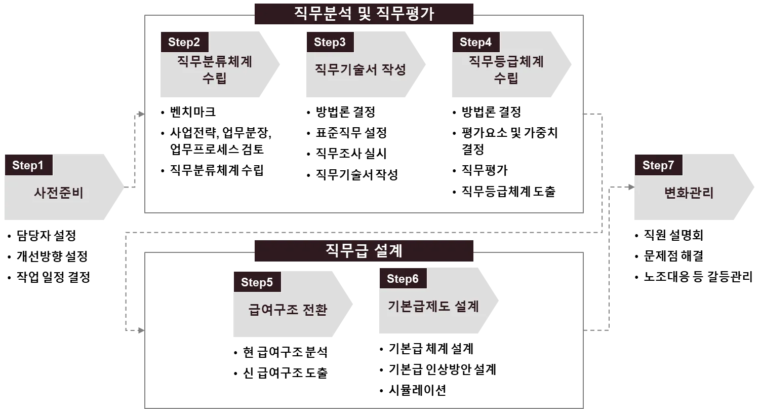 직무급은 사전준비, 직무분석, 직무평가, 직무급 구축, 직무급 운영 방안 수립 등의 프로세스를 통해 구축 합니다.