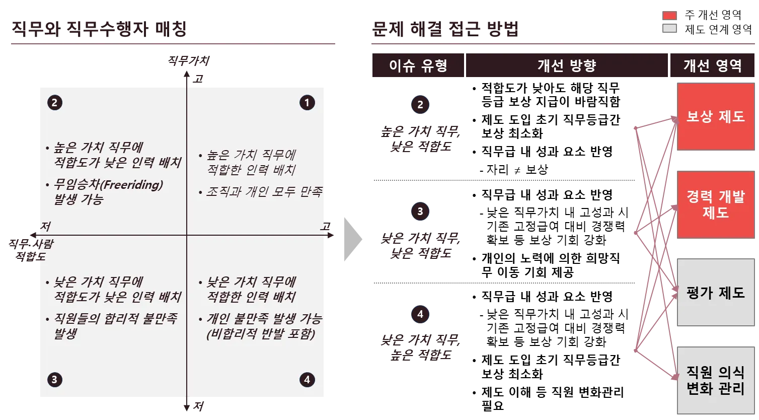 직무급 도입과 연계하여 고려할 때, 개인의 준비 노력도에 따라 이동할 수 있는 기회를 제공하고 직무 전문성을 향상시킬 수 있는 제도를 구축하는 것이 필요합니다.