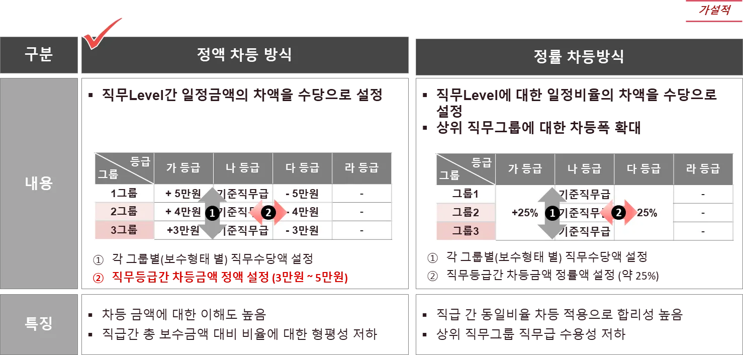 직무급 차등 방식에는 직무Level 간 일정금액의 차액을 수당으로 설정하는 정액 차등 방식과 일정비율의 차액을 수당으로 설정하는 정률 차등방식이 있습니다.