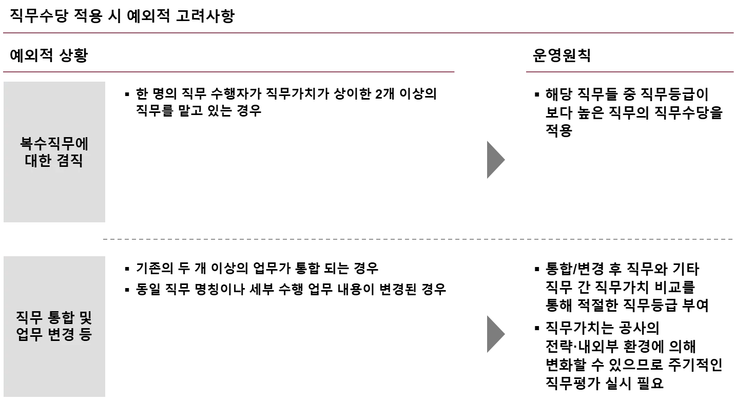 복수 직무의 겸직 또는 직무 신설 및 통합 변경의 경우, 해당 직무의 가치를 고려하여 적용되는 등급 또는 수당을 조정해야 합니다.