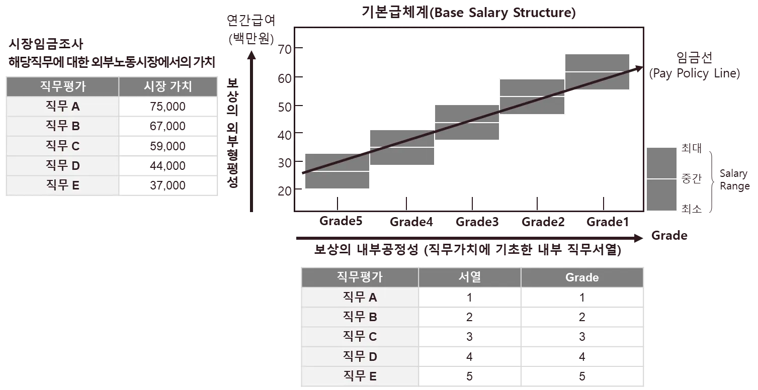 직무평가의 최종산출물은 “직무등급체계(Job Grade Structure)”이며, 여기에 외부 시장가치를 반영하여 최종적으로 직무별 기본급 수준을 결정하게 됩니다.