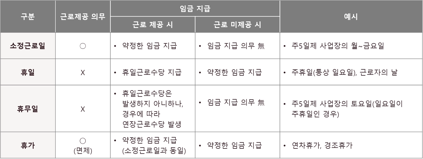 휴무일 | 주5일 근무제 실시로 새롭게 생겨난 개념으로 소정근로일이었으나 사용자가 근로제공 의무를 면제하여 소정근로일에서 제외되는 날