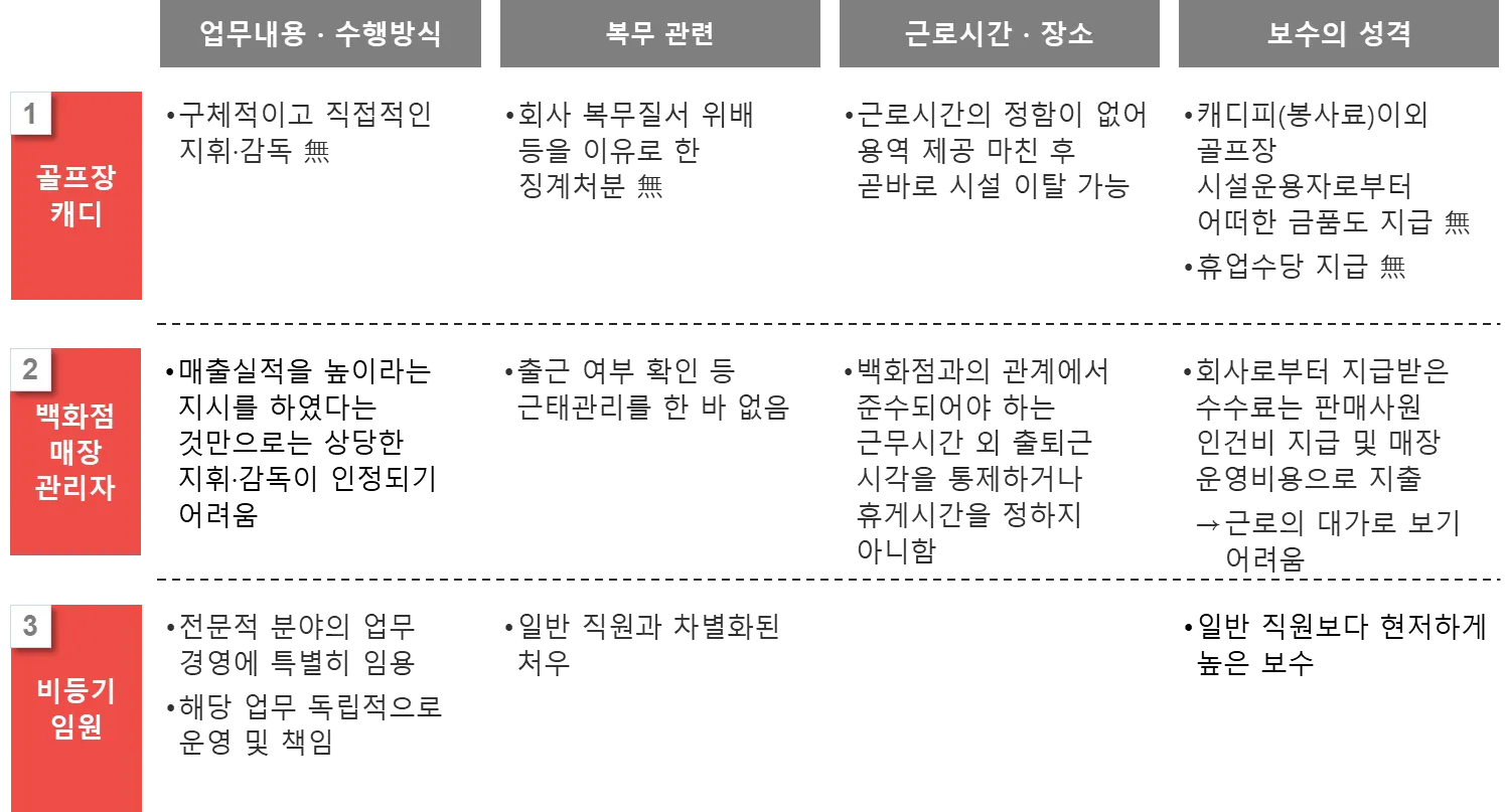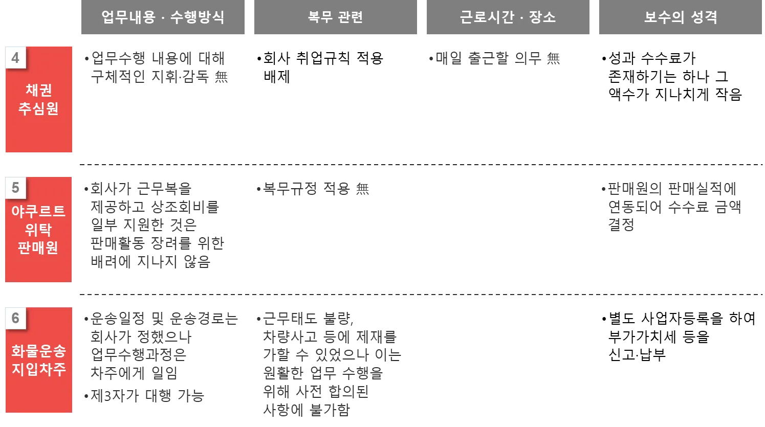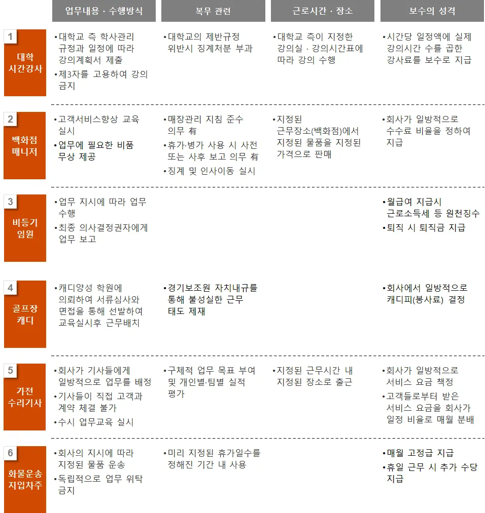 비품 제공, 겸업 제한, 제3자 고용으로 업무 대행 금지, 업무 교육, 업무 처리 보고, 업무수행과정에서 상당한 지휘·감독