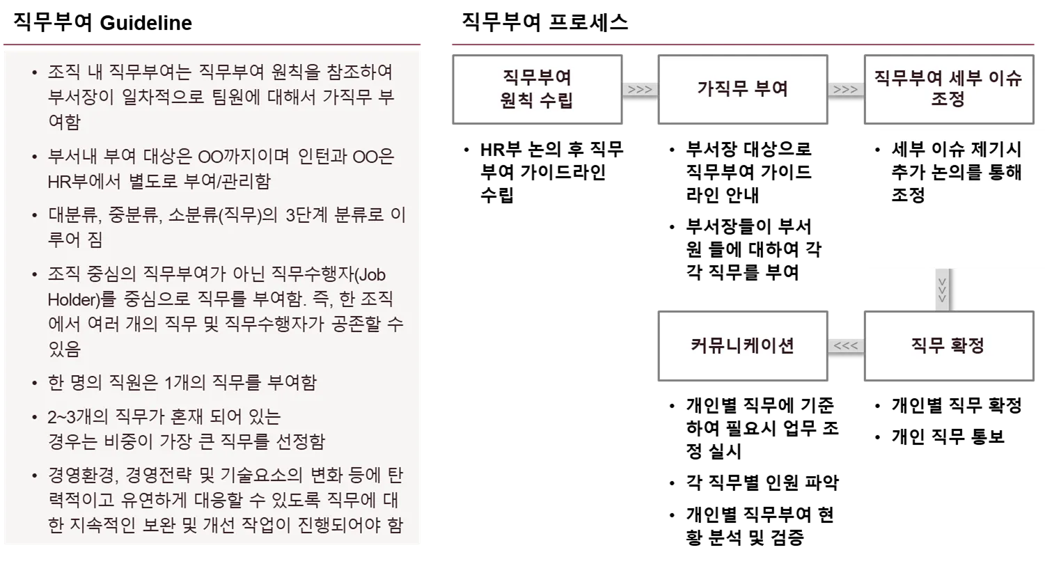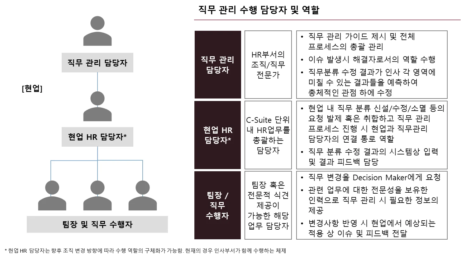 체계적인 직무 관리를 위하여 HR 부서와 현업 HR 담당자, 그리고 각 현업과의 긴밀한 체계 내에서 담당 역할과 책임을 명확히 하여 원활하게 진행하는 것이 중요합니다.