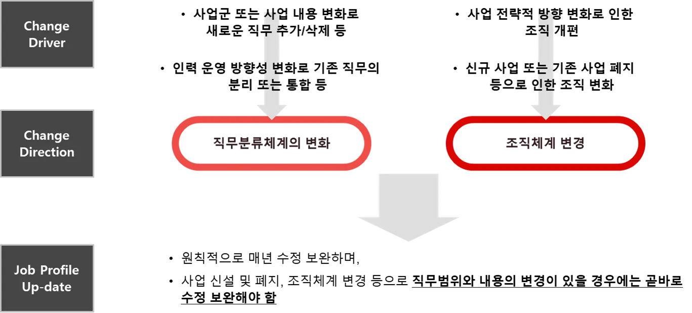 향후 직무 환경의 변화에 따라 안정적인 인사제도의 운영을 위해서는 직무 내용 및 분류 체계의 지속적인 Update가 필요 합니다.
