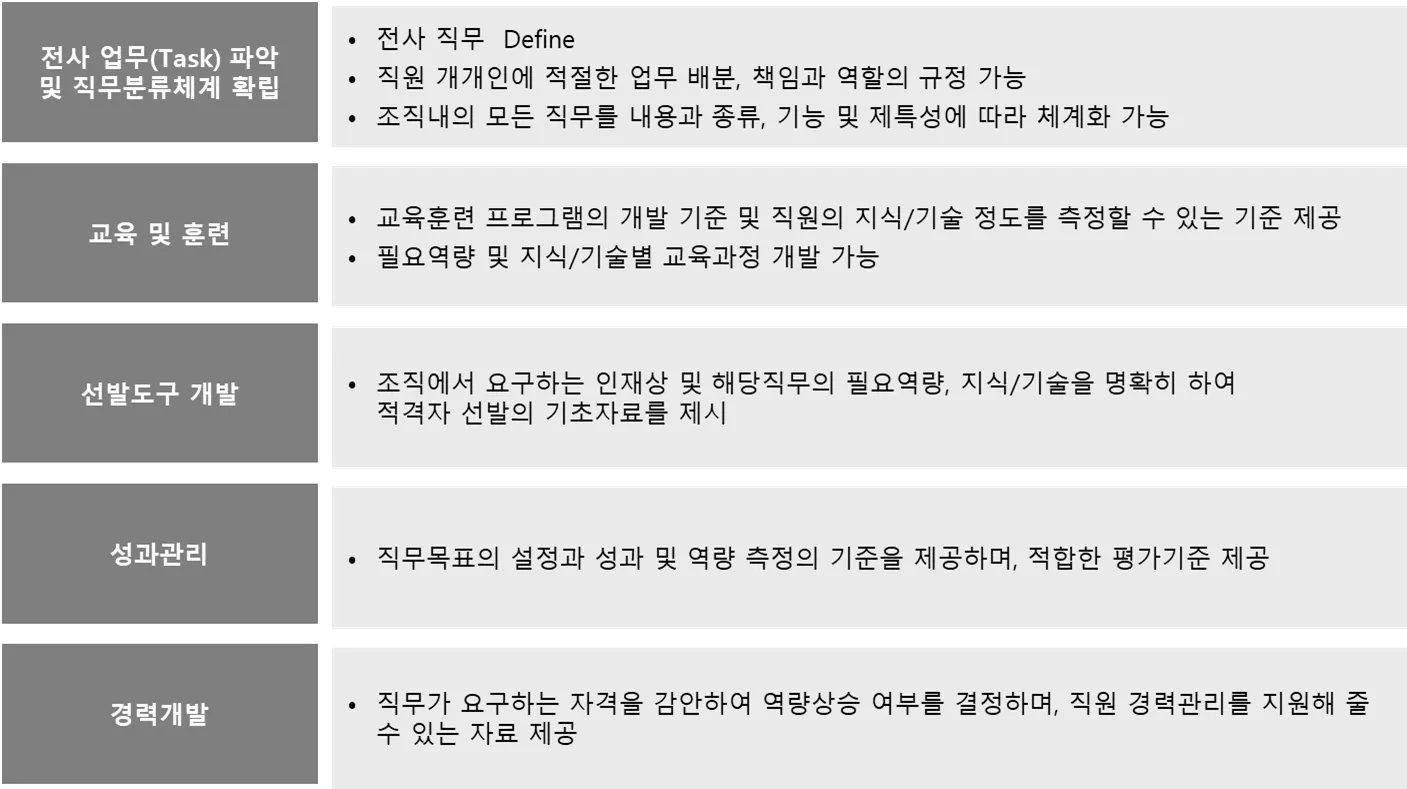 직무조사를 통해 직무분류체계를 도출하고, 직무기술서를 작성하여 적정인력 산정, 경력개발, 교육 및 훈련, 채용, 성과관리에 활용할 수 있습니다.