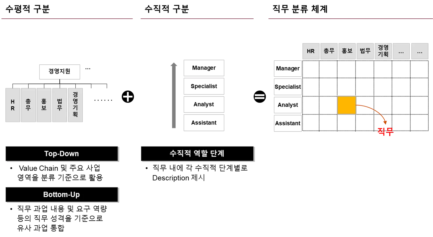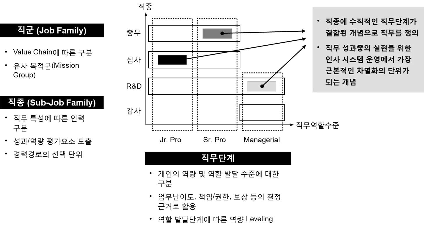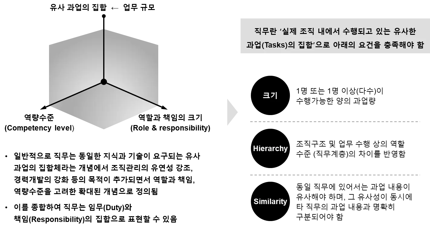 직무는 동일한 과업영역에 수직적인 직무 단계(역할)를 결합한 개념으로 이해해야 합니다.