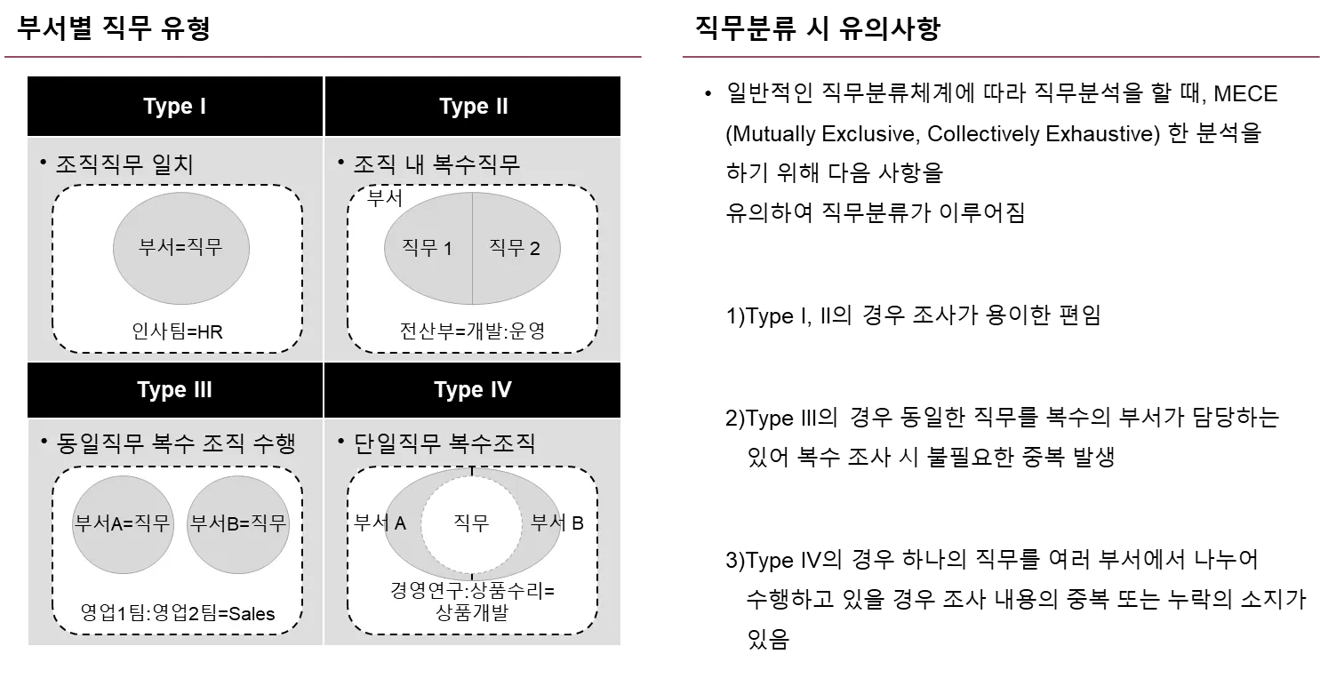 조직 내 직무유형은 일반적으로 아래와 같은 4가지 형태가 존재하며 조직 특성 및 분석 목적에 따라 직무분류 체계를 가져갑니다.