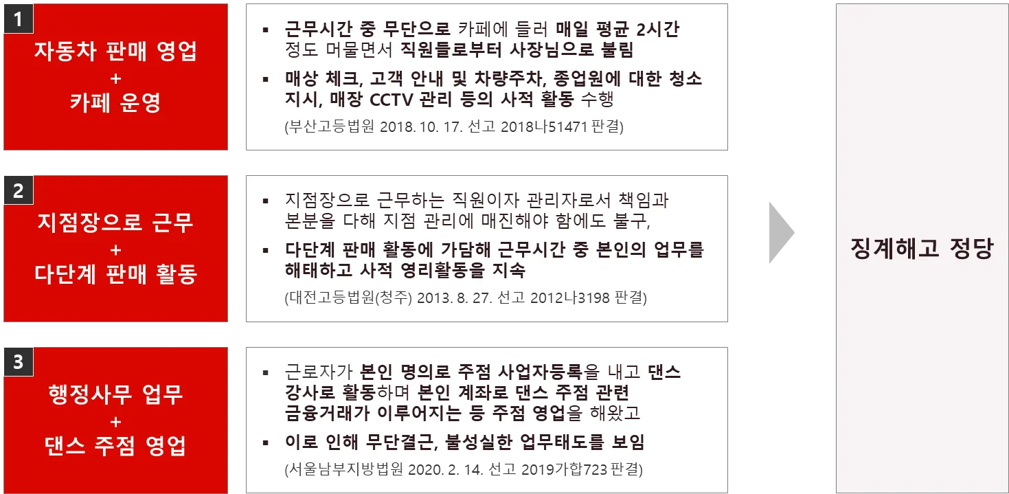 재직 중인 직원의 겸직 등을 이유로 해당 직원에 대한 징계면직이 이어진 사안에서, 기업질서나 노무제공에 지장이 없는 겸직까지 전면적-포괄적으로 금지하는 것은 부당하다는 전제하에 근로자가 자동차부품제조업체에 재직 중임에도 사적으로 다방 영업을 수행한 경우, 이로 인해 회사의 기업질서나 노무제공에 지장이 초래됐다고 볼 증거가 없으므로 징계사유로 삼을 수 없다.