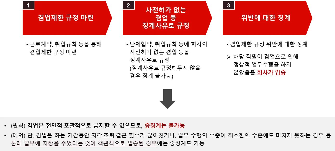 근로자의 근로제공 불성실, 직장질서 침해 등에 대해 회사가 입증하여야 겸업금지의무 위반에 따른 징계가 가능할 것임.