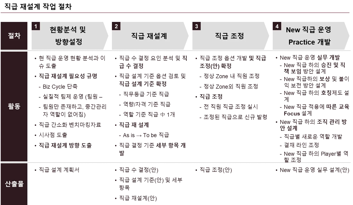 직급 설계는 현황 분석 및 방향 설정 - 직급 재설계 - 직급 조정 - 직급 운영 설계(안)으로 이루어집니다.