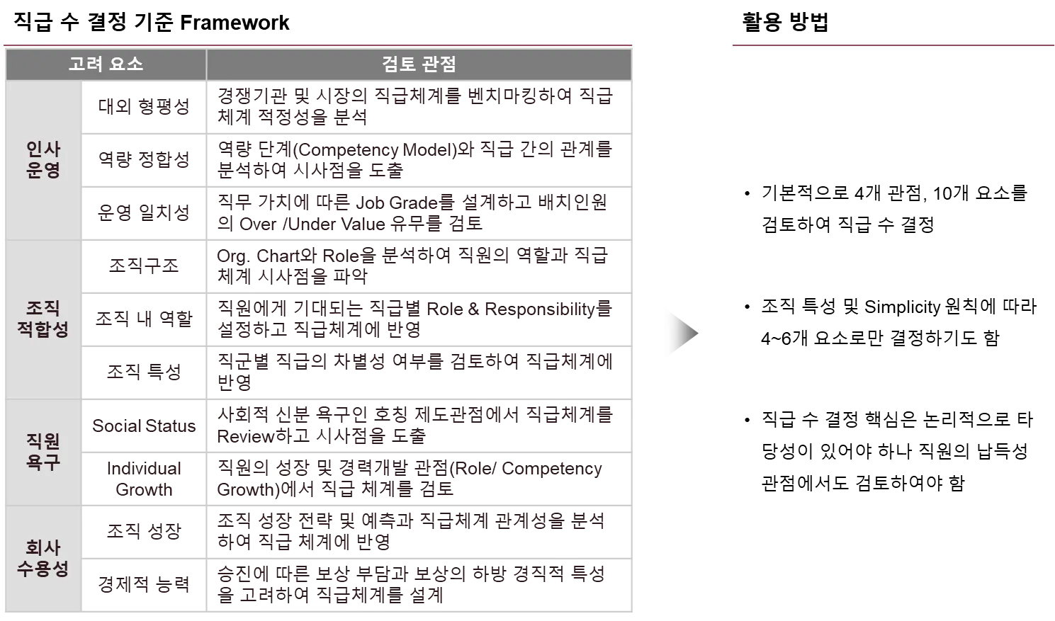 직급 재설계시 직급수를 결정하는 것이 중요하며, 결정 방법은 다음과 같은 고려요소를 검토하여 설계합니다.