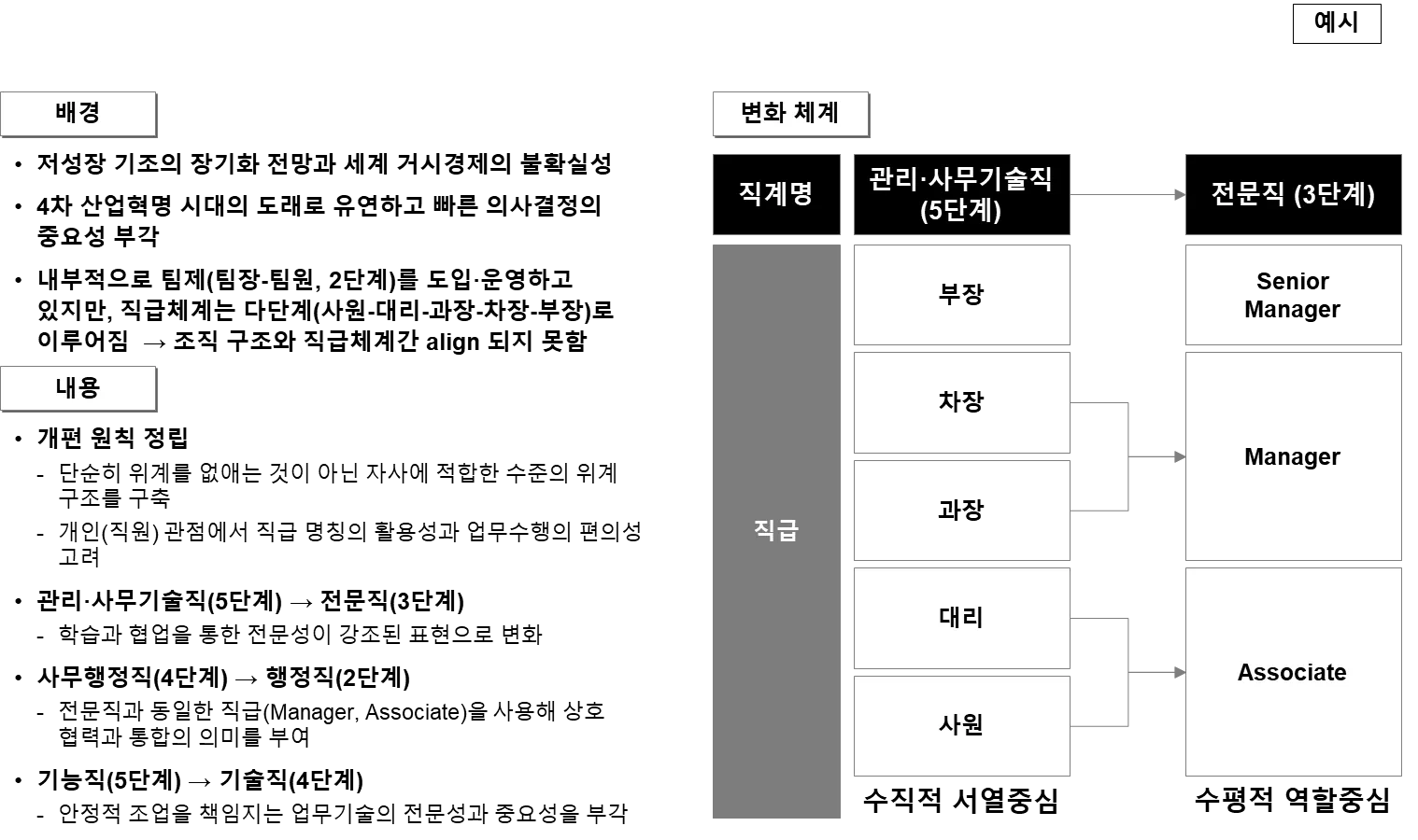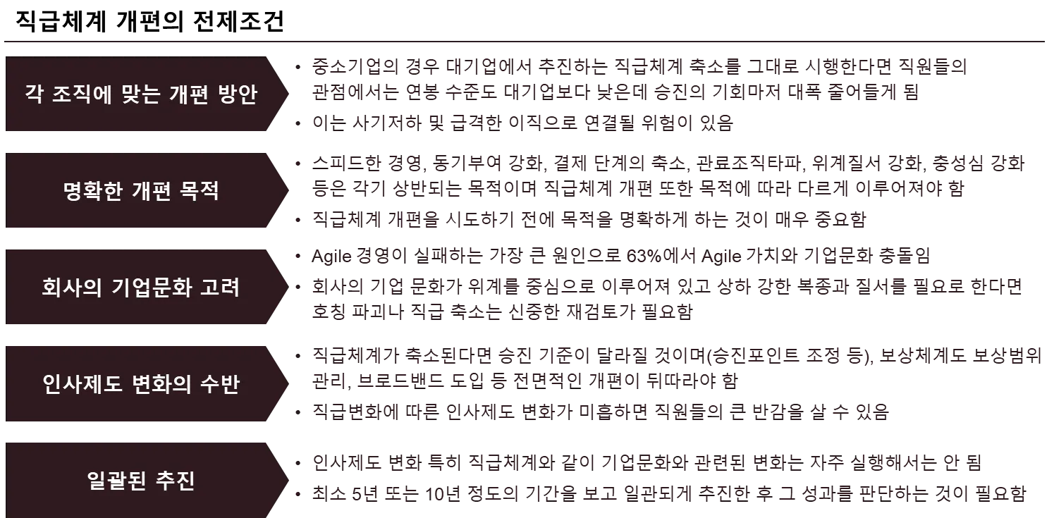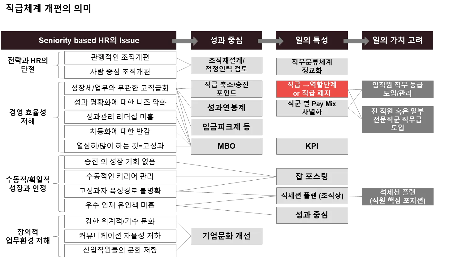 국내기업 인사혁신 과정에서 직급축소 혹은 폐지가 가지는 의미는 다음과 같이 정리할 수 있습니다.