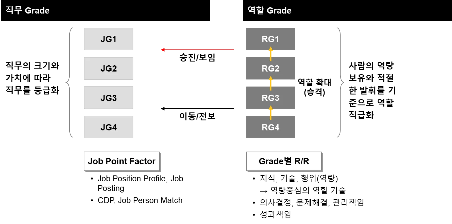 직무의 크기와 가치에 따라 직무를 등급화 한 직무 Grade와, 사람의 역량 보유와 발휘를 기준으로 역할 직급 Grade를 일치시키는 방향으로 인사운영을 하게 됩니다.