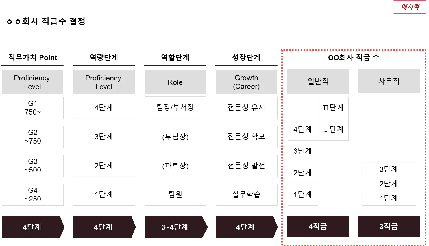 직급 수 결정 시, 직무평가 결과, 역량단계, 역할단계 및 성장단계 분석 결과를 종합적을 고려하여 결정한 예시는 다음과 같습니다.